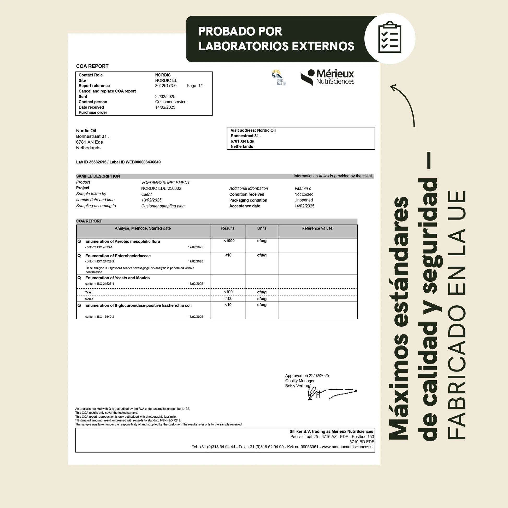 El ascorbato de calcio presente en nuestras cápsulas se produce sintéticamente para garantizar una pureza y calidad constantes.