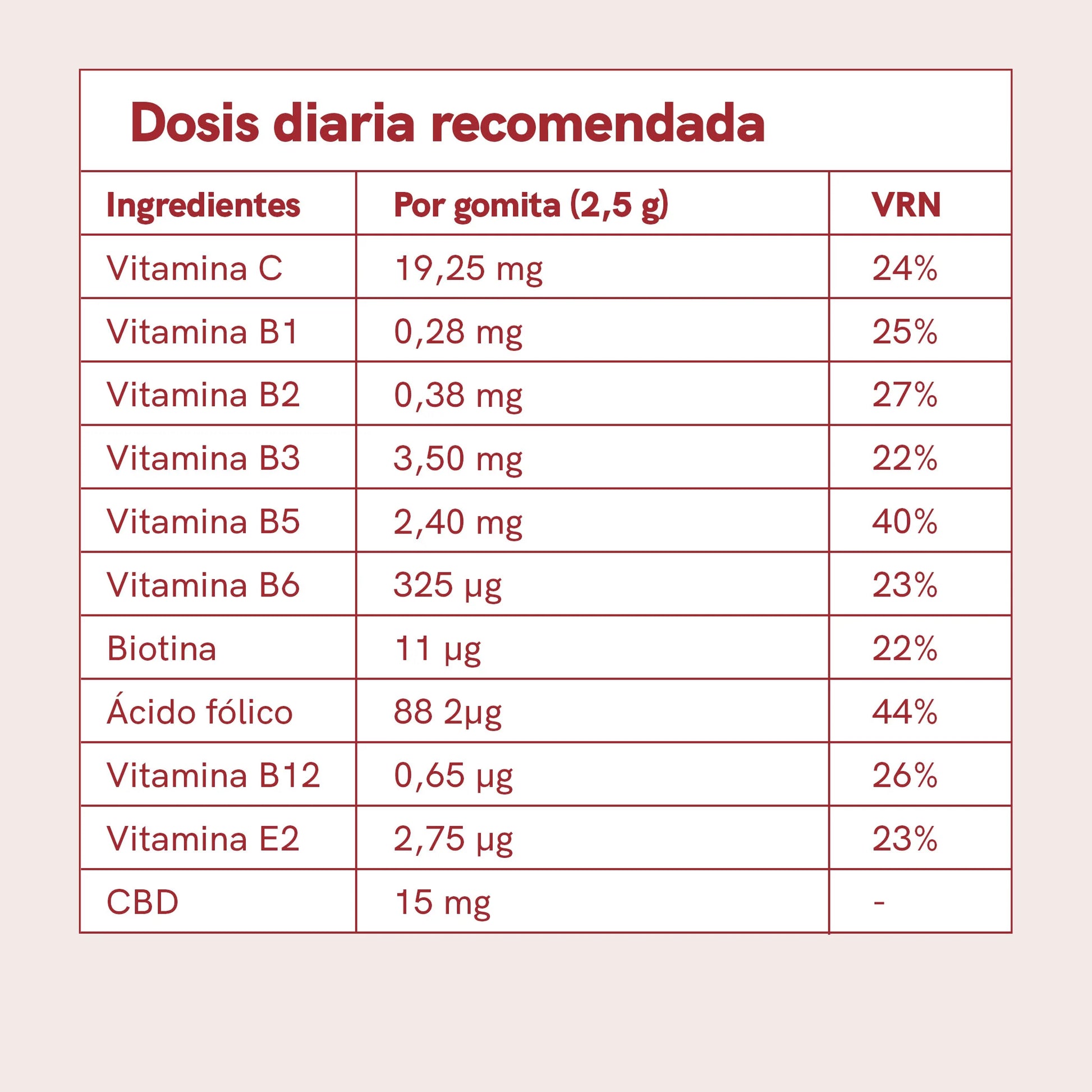 Las vitaminas añadidas en las gomitas de CBD favorecen diversas funciones corporales importantes: la vitamina C contribuye al funcionamiento normal del sistema inmunitario y a la formación de colágeno. Las vitaminas B ayudan a reducir la fatiga y favorecen el metabolismo energético. La biotina contribuye al mantenimiento de una piel y un cabello sanos.