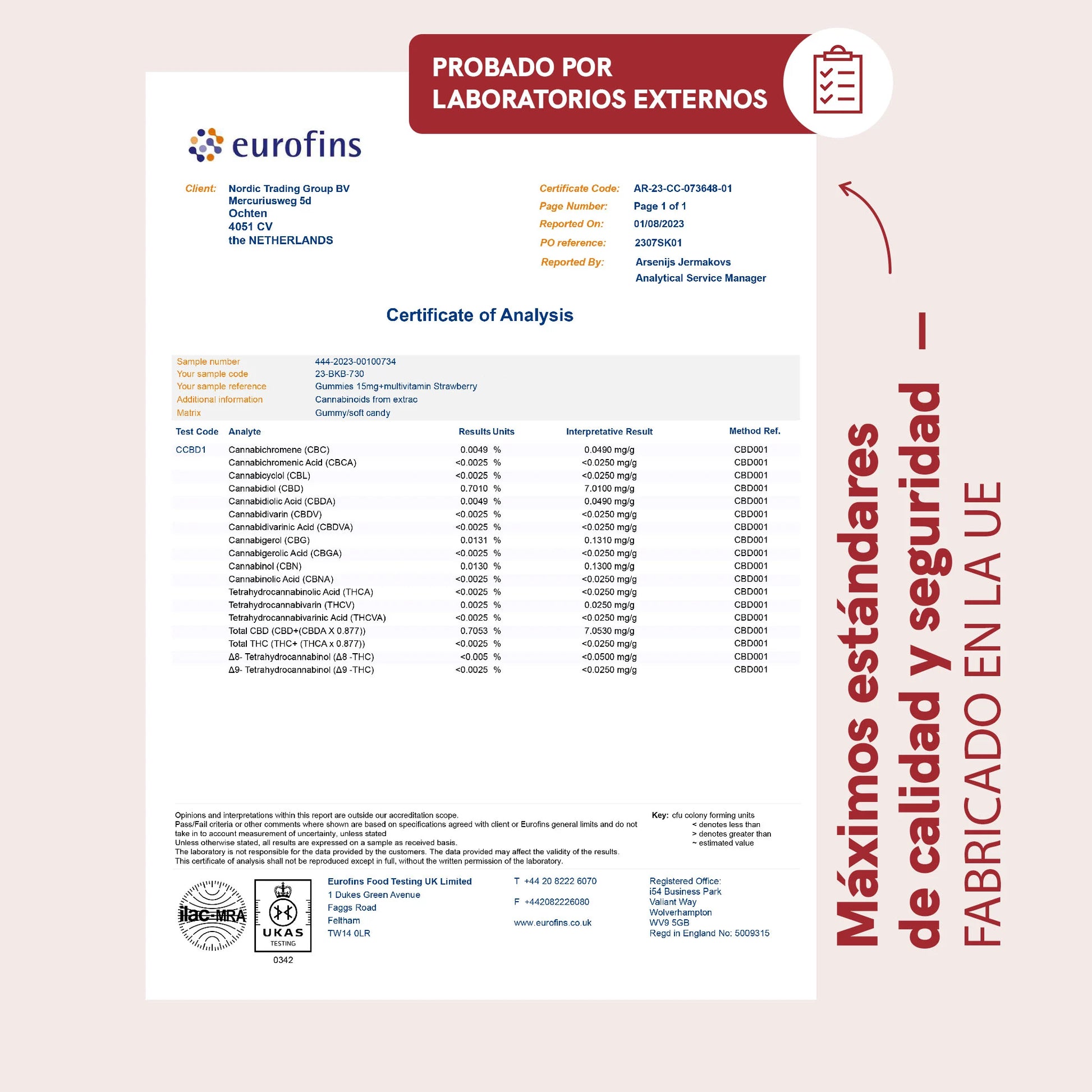 Jarabe de maltitol, maltitol, agua, vitaminas (vitamina E, vitamina B1, vitamina B2, vitamina B3, vitamina B5, vitamina B6, vitamina B12, vitamina C, ácido fólico, biotina), pectina, ácido cítrico, tartrato de potasio y sodio, concentrado (batata, zanahoria), extracto de cáñamo, aroma natural de fresa, citrato de sodio, aromas naturales, cera de carnauba, maltodextrina.